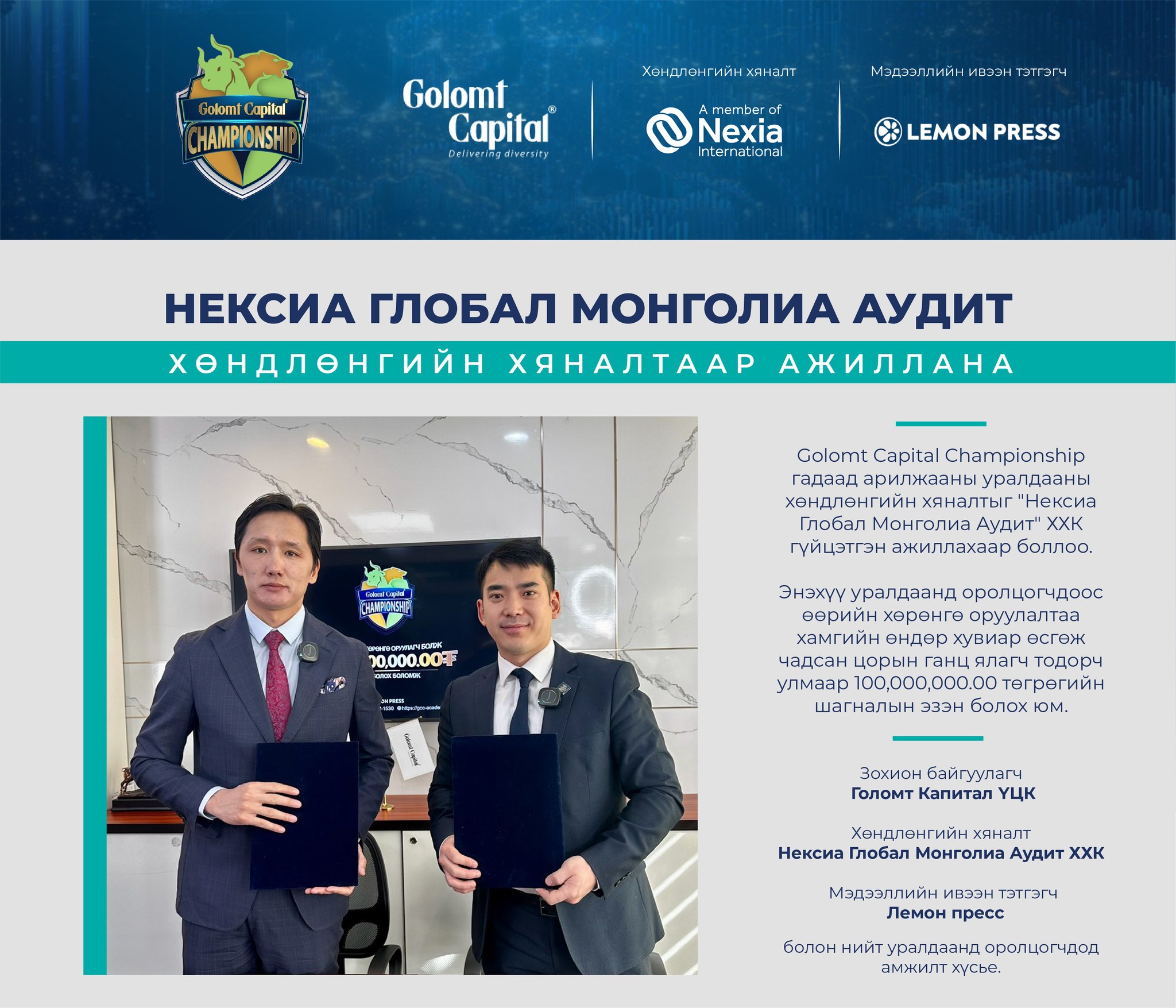 Манай компани нь Дэлхийд ТОП-8 ордог аудит, нягтлан бодох бүртгэл, татвар болон бизнесийн зөвлөх үйлчилгээний тэргүүлэгч, Лондон хотноо төвтэй Nexia-ийн Монгол Улсыг төлөөлөх хараат бус бие даасан гишүүн компани билээ. Манай компани нь үйл ажиллагаагаа 2021 оноос явуулж эхэлсэн бөгөөд 2022 оноос Nexia-ийн Монгол Улсыг төлөөлөх хараат бус бие даасан гишүүн байгууллагаар ажиллаж эхэлсэн билээ.