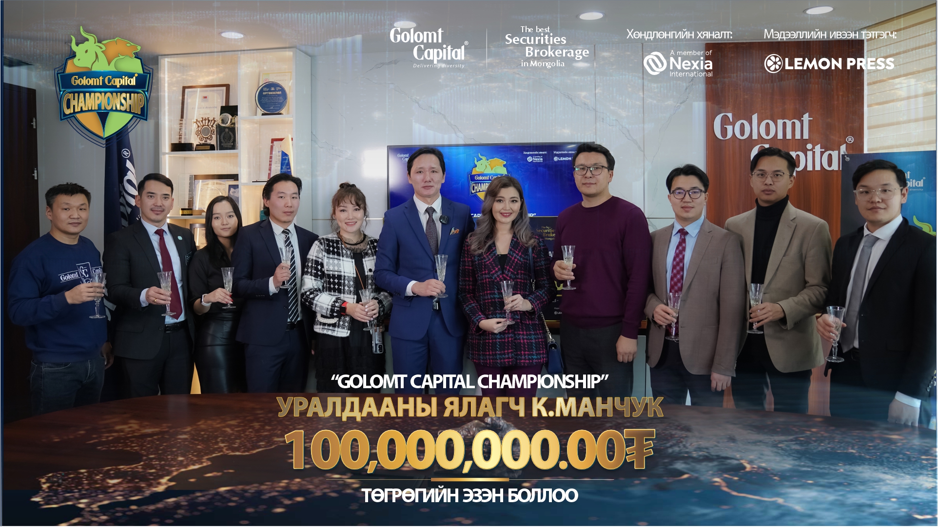 “Голомт Капитал ҮЦК” ХХК нь харилцагчдадаа дэлхийн хөрөнгийн зах зээлийн боломжийг нээх, мэдлэг олгох, хүртэх өгөөжийг нь нэмэгдүүлэх зорилгоор Монголын хамгийн өндөр дүнтэй буюу 100,000,000.00 төгрөгийн шагналын сантай “GОLOMT CAPITAL CHAMPIONSHIP” гадаад арилжааныг уралдааныг 2023.03.13-аас эхлэн 40 долоо хоногийн туршид амжилттай зохион байгууллаа.