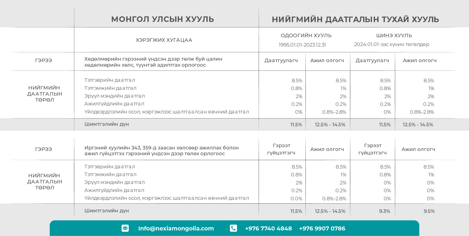 2023 оны 7-р сарын 7-ны өдөр Нийгмийн даатгалын тухай хууль шинэчлэн батлагдсан бөгөөд 2024 оны 1-р сарын 1-ээс хүчин төгөлдөр хэрэгжих болно. Дараах хуулийн шинэчлэл нь ажил олгогчийн хувьд чухал байгаа тул доорх слайдаар хуваалцаж байна.
